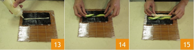 Verteilen Sie einen Streifen Mayonnaise in der Mitte der Alge, verwenden Sie eine Küchenflasche, um ein präziseres Ergebnis zu erzielen 13. Platzieren Sie darauf zwei Avocadospalten, eine direkt neben der anderen 14, sodass die gesamte Länge der Alge gefüllt ist. Fügen Sie daneben, zu Ihnen hin, das Krabbenfleisch (Königskrabbe) hinzu 15, lassen Sie etwa 2-3 cm Abstand zwischen den Zutaten und dem Rand des Blattes.