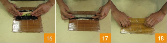 Heben Sie mit beiden Händen den Rand der Matte, der Ihnen am nächsten ist, und beginnen Sie, sie zu rollen. Üben Sie leichten Druck mit den Fingern aus, schieben Sie die Zutaten nach innen 16, heben Sie die Matte erneut an 17 und beenden Sie das Rollen der Rolle. Üben Sie den gleichen Druck aus 18.