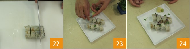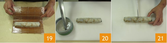 Öffnen Sie dann die Matte 19 und legen Sie die Uramaki auf ein Schneidebrett. Befeuchten Sie die Klinge eines Messers mit einfachem Wasser, um die Schneide nicht zu beschädigen 20. Schneiden Sie die Rolle in der Mitte 21,