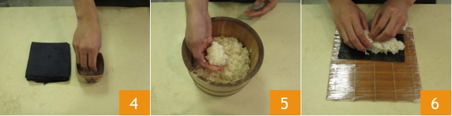 Befeuchten Sie Ihre Hände mit säurehaltigem Wasser 4 und nehmen Sie 120 g lauwarmen Reis 5. Verteilen Sie ihn, indem Sie ihn mit den Fingerspitzen 6 drücken und gleichmäßig über die gesamte Oberfläche der Nori-Alge verteilen. Die Reisschicht sollte nicht zu dick sein. Helfen Sie sich, indem Sie Ihre Hände mit säurehaltigem Wasser befeuchten. Mit der Erfahrung werden Sie verstehen, wie viel Sie benötigen: Wenn es zu viel ist, rutscht der Reis aus den Händen, wenn es zu wenig ist, bleibt er kleben.