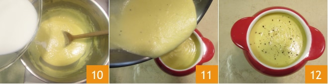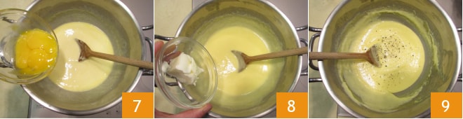 Am Anfang sehen Sie eine Masse, die sich dann nach und nach auflöst und flüssiger wird. An diesem Punkt die Eigelbe nacheinander dazugeben 7 und ständig weiterrühren. Auch die kalte Butter hinzugeben 8 und weiter rühren. Pfeffern Sie das Walliser Fondue nach Geschmack 9 und rühren Sie noch einmal um.