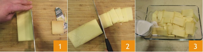 Um das Walliser Fondue zuzubereiten, entfernen Sie zuerst die äußere Rinde des Fontinas 1, dann schneiden Sie ihn dünn 2. Legen Sie den Käse in eine rechteckige Auflaufform und gießen Sie die Milch darüber 3.