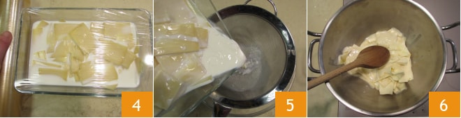 Decken Sie mit Frischhaltefolie ab 4 und lassen Sie es über Nacht im Kühlschrank. Nach der Ruhezeit im Kühlschrank den Käse durch ein Sieb abtropfen lassen 5 und die Milch beiseite stellen. In einer Schüssel, die auf einem Topf für das Wasserbad steht, den abgetropften Käse platzieren. Den Käse bei mittlerer Hitze unter Rühren mit einem Holzlöffel schmelzen 6.