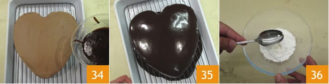 Nehmen Sie den Kuchen aus dem Kühlschrank und legen Sie ihn auf ein Gitter, das Sie auf einem Tablett platziert haben, dann gießen Sie die Glasur darüber 34, um den Kuchen gleichmäßig zu bedecken 35. Stellen Sie den glasierten Kuchen für etwa 30 Minuten in den Kühlschrank. Bereiten Sie inzwischen die Wasserglasur für die Dekoration vor, indem Sie Puderzucker mit Wasser in einer Schüssel vermischen 36.