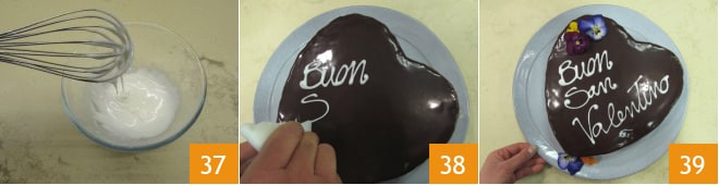 Wenn Sie eine glatte und gleichmäßige Konsistenz erhalten haben 37, geben Sie die Glasur in ein Papierkonus und dekorieren Sie den Kuchen mit einer beliebigen Aufschrift 38. Garnieren Sie mit essbaren Blumen und servieren Sie Ihren romantischen Valentinstag-Herzkuchen 39!
