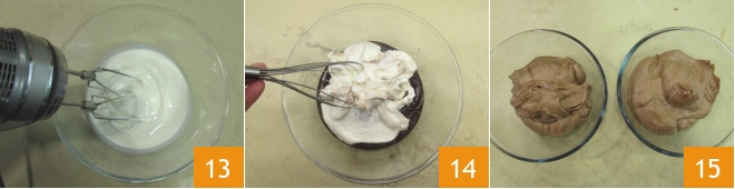 Nach dieser Zeit gießen Sie die restlichen 300 g Sahne in eine Schüssel und schlagen Sie sie mit einem elektrischen Mixer auf 13. Fügen Sie die aufgeschlagene Sahne zur kalten Ganache hinzu 14 und rühren Sie vorsichtig von unten nach oben, um sie zu integrieren. Teilen Sie die erhaltene Mischung in 2 Schüsseln: eine mit 350 g für die Füllung und die andere mit 300 g für die Abdeckung 15. Stellen Sie beide Schüsseln in den Kühlschrank.