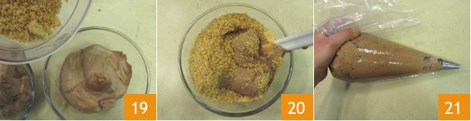 Fügen Sie nun die gehackten Haselnüsse den 350 g Ganache für die Füllung hinzu 19 und rühren Sie, um eine homogene Masse zu erhalten 20. Geben Sie die Füllung in einen Spritzbeutel mit einer glatten Tülle von 1 cm 21.