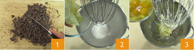 Um den Valentinstags-Herzkuchen zuzubereiten, hacken Sie zuerst die Bitterschokolade, die Sie für die verschiedenen Zubereitungen benötigen 1. Nehmen Sie 100 g, die Sie für die Zubereitung des Teigs benötigen, und schmelzen Sie sie in der Mikrowelle oder im Wasserbad, lassen Sie sie dann abkühlen, indem Sie gelegentlich umrühren. In die Schüssel einer Küchenmaschine geben Sie den Zucker und die Butter bei Raumtemperatur 2, arbeiten Sie mit dem Schneebesen, bis Sie eine cremige Masse erhalten. Fügen Sie die Eier nacheinander hinzu 3, wobei Sie darauf achten, dass jedes Ei gut aufgenommen wird, bevor Sie das nächste hinzufügen.