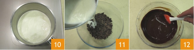 In der Zwischenzeit können Sie die Ganache zubereiten: Geben Sie 200 g gehackte Schokolade in eine Schüssel und bringen Sie 200 g frische Sahne zum Kochen 10. Gießen Sie die Sahne in 3 Schritten über die Schokolade 11, rühren Sie gut mit einem Teigspatel um 12. Decken Sie sie mit Frischhaltefolie ab und lassen Sie sie mindestens eine Stunde im Kühlschrank abkühlen.