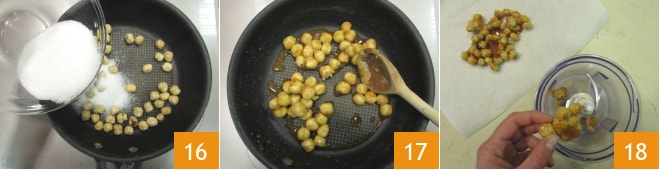 Fahren Sie mit den karamellisierten Haselnüssen fort: Geben Sie die Haselnüsse und den Zucker in einen kleinen Topf 16 und kochen Sie bei mittlerer Hitze, bis der Zucker geschmolzen ist und eine bernsteinfarbene Farbe angenommen hat 17. Übertragen Sie die karamellisierten Haselnüsse auf ein Blatt Backpapier und lassen Sie sie abkühlen, dann hacken Sie sie fein mit einem Mixer 18.