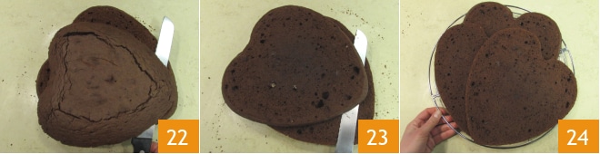 Nehmen Sie den Kuchen, der vollständig abgekühlt ist, und glätten Sie die Oberfläche mit einem gezackten Messer 22, dann schneiden Sie den Rest horizontal in 3 Schichten von etwa 1 cm Dicke 23 24.