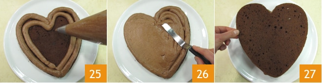 Legen Sie die erste Schicht auf eine Platte und füllen Sie sie mit der Haselnuss-Ganache 25. Verteilen Sie die Creme gleichmäßig mit einem Spatel 26, bedecken Sie sie mit der zweiten Schicht und füllen Sie diese auf dieselbe Weise. Schließlich bedecken Sie sie mit der letzten Kuchenschicht 27 und stellen Sie sie für etwa 15-20 Minuten in den Kühlschrank, um sie fest werden zu lassen.