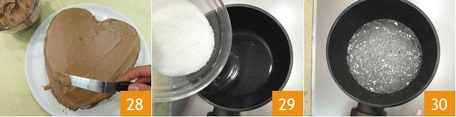 Nach dieser Zeit nehmen Sie den gefüllten Kuchen und bedecken Sie sowohl die Seiten als auch die Oberfläche mit den 300 g Ganache, die Sie für die Abdeckung beiseitegelegt haben, und verwenden Sie einen Spatel, um sie glatt und gleichmäßig zu machen 28. Stellen Sie den Kuchen erneut für etwa 15-20 Minuten in den Kühlschrank. In der Zwischenzeit bereiten Sie die Schokoladenglasur vor: Gießen Sie Wasser und Zucker in einen kleinen Topf 29, lassen Sie es aufkochen und kochen Sie es 3 Minuten lang 30.