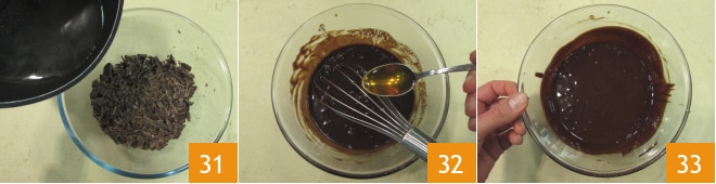 Geben Sie 170 g gehackte Bitterschokolade in eine Schüssel, gießen Sie dann den Sirup direkt auf die Schokolade 31 und rühren Sie kräftig mit einem Schneebesen um. Fügen Sie den Honig hinzu 32 und rühren Sie erneut, um eine homogene Masse zu erhalten 33.