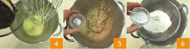 Wenn Sie eine schaumige und homogene Creme erhalten haben, fügen Sie die geschmolzene, abgekühlte Schokolade hinzu 4 und rühren Sie weiter, um sie gut zu vermischen. Fügen Sie nun das Salz 5 und die trockenen Zutaten, d.h. Backpulver und Mehl, hinzu, indem Sie sie direkt in die Schüssel sieben 6.