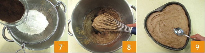 Sieben Sie auch den ungesüßten Kakao 7 und rühren Sie mit einem Handschneebesen, um alles zu vermischen 8. Gießen Sie den Teig in eine Herzform der Größe 21x22 cm und glätten Sie die Oberfläche mit der Rückseite eines Löffels 9. Backen Sie im vorgeheizten statischen Ofen bei 180° für etwa 40-45 Minuten. Überprüfen Sie dann die Garstufe mit einem Zahnstocher, nehmen Sie den Kuchen aus dem Ofen und lassen Sie ihn in der Form abkühlen, bevor Sie ihn aus der Form nehmen und vollständig abkühlen lassen.