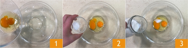 Um die Valdostana-Crêpes zuzubereiten, beginnen Sie mit dem Crêpeteig: Lassen Sie die Butter in einem kleinen Topf schmelzen und abkühlen. In der Zwischenzeit geben Sie die Eier 1, das Salz 2 und die Milch 3 in eine Schüssel.