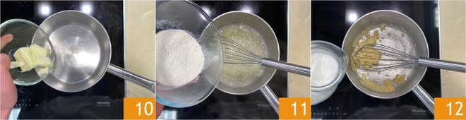 Nun kümmern Sie sich um die Béchamelsauce: Erwärmen Sie die Milch in einem kleinen Topf, während Sie in einem anderen Topf die Butter schmelzen lassen 10. Sobald die Butter geschmolzen ist, streuen Sie das Mehl hinein 11 und rühren kräftig mit einem Schneebesen, bis ein Roux entsteht. Dann fügen Sie etwas warme Milch hinzu 12.