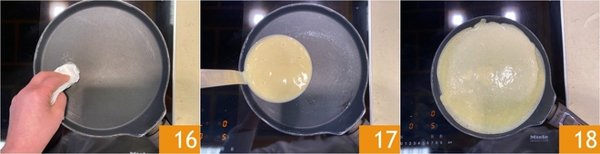Nach der Ruhezeit des Teigs fahren Sie mit dem Backen der Crêpes fort: Erhitzen Sie eine Crêpe-Pfanne oder eine antihaftbeschichtete Pfanne mit einem Durchmesser von 18 cm und fetten Sie sie mit einer dünnen Schicht Butter ein 16. Gießen Sie eine Kelle Teig in die Mitte der Pfanne 17 und schwenken Sie sie, um den Teig gleichmäßig zu verteilen. Backen Sie bei mittlerer bis niedriger Hitze, bis sich die Ränder der Crêpe zu heben beginnen 18, dann wenden Sie sie und backen Sie sie noch etwa eine Minute weiter. Mit diesen Mengen erhalten Sie etwa 8 Crêpes.