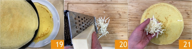 Stapeln Sie die Crêpes auf einem Teller, während sie fertig werden 19. Nun sind Sie bereit, die Crêpes zu füllen: Reiben Sie den Fontina mit einer groben Reibe 20 und verteilen Sie ihn auf der Oberfläche der ersten Crêpe 21.