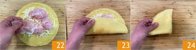 Legen Sie auch die Scheiben des gekochten Schinkens darauf 22 und falten Sie die Crêpe zuerst zur Hälfte 23 und dann noch einmal zur Hälfte 24, um ein Dreieck zu formen. Fahren Sie auf diese Weise fort, um alle Crêpes zu füllen.