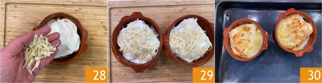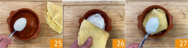 Nehmen Sie nun einige Einzelportionen-Schalen und bedecken Sie den Boden mit Béchamelsauce 25, dann legen Sie eine gefüllte Crêpe darauf 26 und bedecken Sie sie mit weiterer Béchamelsauce 26.