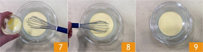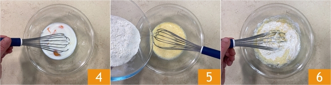 Vermischen Sie die Zutaten mit einem Schneebesen 4, fügen Sie dann das gesiebte Mehl hinzu 5 und rühren Sie gut um, um Klumpen zu vermeiden 6.