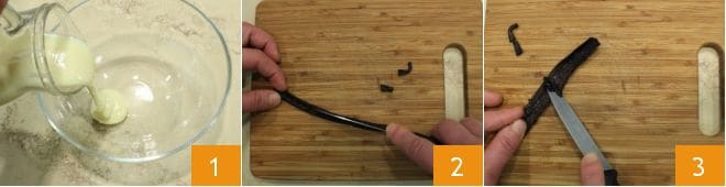 Um das Vanilleeis mit knusprigen Nüssen zuzubereiten, beginnen Sie damit, die Kondensmilch in eine große Schüssel zu geben 1, dann nehmen Sie die Vanilleschote, schneiden Sie sie mit einem scharfen Messer der Länge nach auf 2, und entnehmen Sie die Samen 3