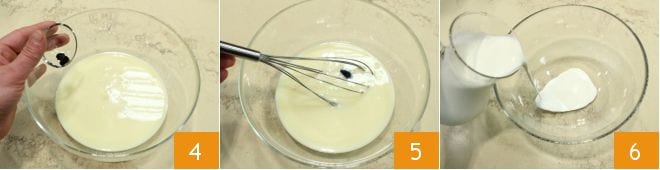 und fügen Sie sie der Kondensmilch hinzu 4, rühren Sie mit einem Schneebesen um 5 und stellen Sie sie beiseite. In eine andere Schüssel geben Sie die frische flüssige Sahne 6