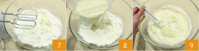 und schlagen Sie sie steif 7, vermischen Sie die aromatisierte Kondensmilch mit Vanille mit der Sahne 8 und rühren Sie vorsichtig mit einem Spatel um, um die Sahne nicht zu entmutigen 9, bis eine homogene Mischung entsteht.
