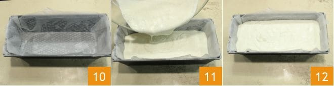 Fetten Sie eine Form oder ein hohes Backblech ein, eine Kastenform ist für diese Zubereitung perfekt, und legen Sie die Ränder und den Boden mit Backpapier aus 10, dann geben Sie das Vanilleeis hinein 11. Stellen Sie die Mischung für 6-8 Stunden in den Gefrierschrank, um sie zu festigen 12.