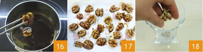 Nach der angegebenen Zeit ist Ihr Eis fertig, widmen Sie sich der Garnierung mit den Nüssen. Stellen Sie einen kleinen Topf auf das Feuer, geben Sie den Kristallzucker hinein 13 und schmelzen Sie den Zucker bei schwacher Hitze, bis er dunkel 14 und flüssig wird. An diesem Punkt schalten Sie das Feuer aus und tauchen Sie die Nüsse für einen Moment ein, um sie mit dem Karamell zu überziehen 15,