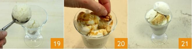 geben Sie dann eine Kugel Eis dazu 19 und fahren Sie fort, indem Sie abwechselnd Eis, Nüsse und Karamell schichten 20. Ihr Vanilleeis mit knusprigen Nüssen ist bereit, um genossen zu werden! 21.