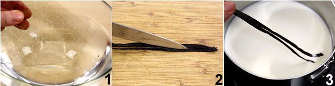 Schalten Sie die Hitze aus, filtern Sie die Mischung in eine Schüssel, um die Schote und eventuelle Rückstände zu entfernen 4, fügen Sie dann die gut ausgepressten Gelatineblätter hinzu und rühren Sie, bis sie sich vollständig aufgelöst haben. In einer hohen Schüssel die Eigelbe und den Zucker geben; mit einem Schneebesen verrühren 5 und dann unter ständigem Rühren die flüssige Mischung aus Milch und Sahne hinzufügen 6. Gießen Sie die erhaltene Mischung in eine Form und lassen Sie sie im Kühlschrank mindestens 4 Stunden lang abkühlen, bevor Sie sie servieren. Wenn es Zeit ist, den Pudding zu stürzen, tauchen Sie die Form für ein paar Sekunden in kochendes Wasser und stürzen Sie dann den Pudding auf eine Servierplatte. Dekorieren Sie den Vanillepudding mit frischem Obst und Sahnetuffs, oder mit süßen Saucen oder anderem nach Ihrem Geschmack.