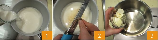 Um die vegane Béchamelsauce zuzubereiten, beginnen Sie damit, die Milch in einen Topf zu gießen 1. Fügen Sie die Muskatnuss hinzu 2 und bringen Sie sie fast zum Kochen. In der Zwischenzeit geben Sie die Margarine in einen weiteren ziemlich großen Topf 3 und lassen Sie sie bei schwacher Hitze schmelzen.