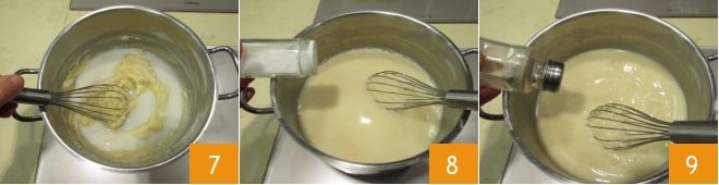 Fügen Sie die heiße Milch nach und nach hinzu 7, bis sie aufgebraucht ist. Dann würzen Sie mit Salz 8 und Pfeffer 9.