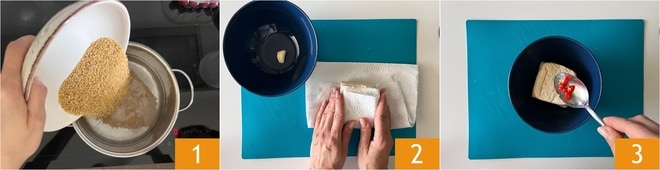 Fügen Sie auch einen Esslöffel Öl hinzu 4, rühren Sie es gut um 5 und lassen Sie es marinieren. Wenn der Bulgur gekocht ist, lassen Sie ihn abtropfen und geben Sie ihn in eine Schüssel 6.