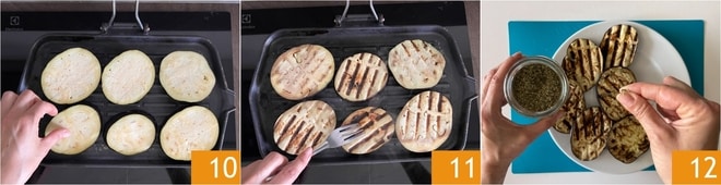 Grillen Sie die Auberginen auf einem heißen Grill 10, indem Sie sie einige Minuten pro Seite bei mittlerer Hitze garen. Wenden Sie sie 11 und beenden Sie das Garen. Würzen Sie sie mit Salz, Oregano und ein wenig Öl 12.