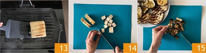 Grillen Sie nun auch den Tofu auf allen Seiten, es dauert nur wenige Minuten 13. Wenn er gut gegrillt ist, legen Sie ihn auf ein Schneidebrett und schneiden Sie ihn in Würfel 14. Schneiden Sie dann auch die Auberginen in Stücke 15.