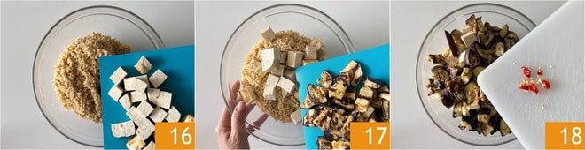 Nehmen Sie die Schüssel mit dem Bulgur und fügen Sie hinzu: Tofu 16, Auberginen 17 und die andere Hälfte der in Scheiben geschnittenen Chilischote 18.
