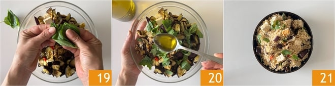 Brechen Sie auch die Basilikumblätter hinein 19 und würzen Sie mit einem Esslöffel Öl 20. Mischen Sie gut und servieren Sie Ihren veganen Bulgursalat 21.