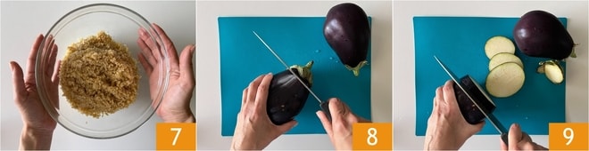 Lassen Sie ihn abkühlen 7 und kümmern Sie sich in der Zwischenzeit um die Auberginen. Schneiden Sie die Enden ab 8 und schneiden Sie sie in dicke Scheiben 9.