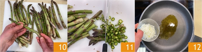 Die Spargelstangen putzen, indem Sie das harte Ende mit der Hand abbrechen 10. Sind die Stangen sehr dick, können Sie den Stiel schälen. Schneiden Sie den Spargel in Scheiben 11 und legen Sie die Spitzen beiseite. In einer Pfanne etwas natives Olivenöl extra erhitzen und die fein gehackte Zwiebel hinzufügen 12.