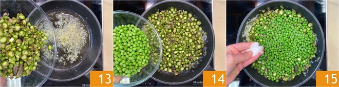 Bei schwacher Hitze anschwitzen lassen. Geben Sie den Spargel 13 und die Erbsen 14 dazu, salzen 15 und 10 Minuten garen lassen (bei Bedarf 1/2 Glas Wasser hinzufügen).