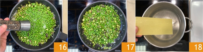 Mit frisch gemahlenem Pfeffer bestreuen 16 und beiseitestellen 17. Die veganen Nudelplatten in gesalzenem Wasser ca. 4–5 Minuten blanchieren 18.