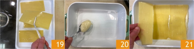 Abgießen und auf einem Tablett leicht abkühlen lassen 19. Nehmen Sie eine Auflaufform von 25x15 cm, geben Sie ein paar Löffel Béchamel auf den Boden 20 und legen Sie eine Schicht Nudelplatten darauf 21.