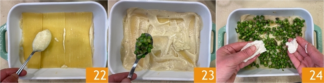 Fahren Sie mit einer zweiten Schicht Nudelplatten fort 25, gefolgt von Béchamel 26, Gemüse 27 und Mozzarella.