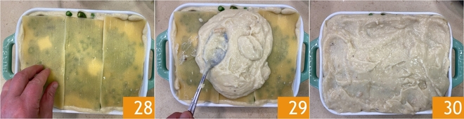 Schließen Sie mit einer letzten Schicht Pasta ab 28 und reichlich Béchamel 29, gleichmäßig verteilt 30.
