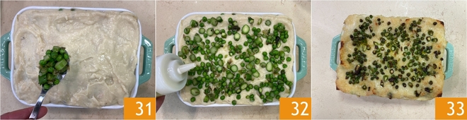 Vervollständigen Sie mit dem Gemüse und den beiseitegelegten rohen Spargelspitzen 31 und beträufeln Sie alles mit etwas Olivenöl 32. Im vorgeheizten Backofen (Ober-/Unterhitze) bei 180 °C 45–50 Minuten backen. Nehmen Sie die veganen Lasagne mit Spargel und Erbsen aus dem Ofen und lassen Sie sie vor dem Servieren etwas abkühlen 33.
