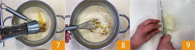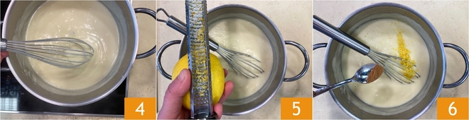 Bei mittlerer bis niedriger Hitze köcheln lassen, bis die Béchamel cremig wird 4. Würzen Sie mit geriebener Zitronenschale 5 und Muskatnuss 6.